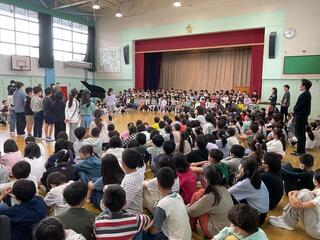 4月14日、1年生を迎える会を開催しました。1年生は、担任の先生から名前を呼ばれて元気に返事をしていました。全校児童で校歌を歌い、温かく1年生を迎えることができました。