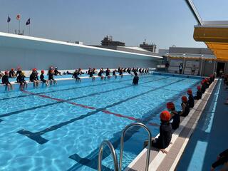 水泳の学習がスタートしました。冷たいプールの水やシャワーの勢いに子どもたちは驚きながらも、ルールをしっかり守って安全に取り組んでいます。