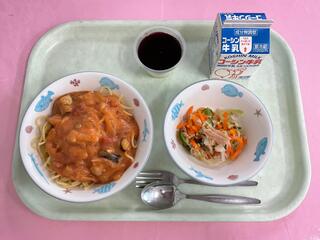 10月10日(金) 「目の愛護デー献立」 牛乳 トマトクリームスパゲッティ にんじんサラダ ミルクゼリーブルーベリーソース