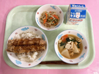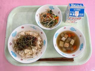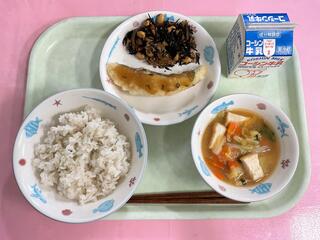 10月7日(火) 牛乳 麦入りご飯 白身魚のみぞれがけ 大豆の磯煮 白菜のみそ汁