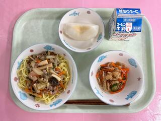 10月15日(水) 牛乳 五目焼きそば あさりのカリッとサラダ 梨(新高)