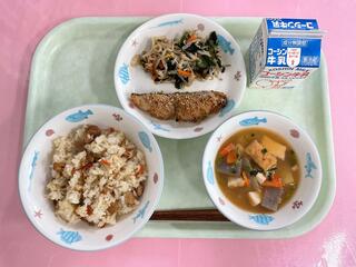 10月2日(木) 牛乳 舞茸ご飯 鰆のごまつけ焼き わかめの和え物 生揚げの豚汁