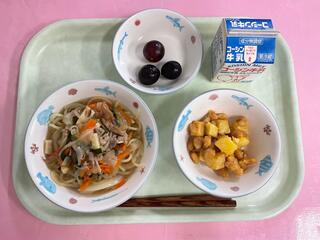 10月3日(金) 牛乳 ちゃんぽん麺 じゃがいもと大豆の甘みそ揚げ ピオーネ