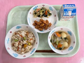 11月4日(火) 「十三夜献立」牛乳 栗枝豆ご飯 いかのかりんあげ わかめのからし和え 月見汁
