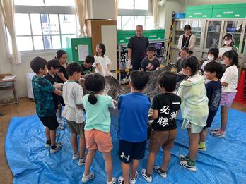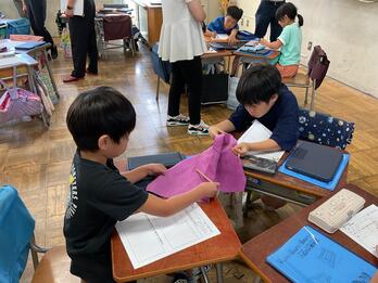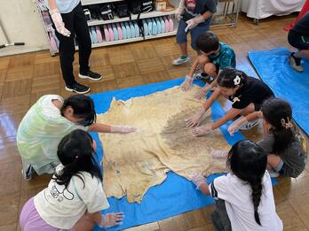 3年は総合的な学習の時間「皮から革へ」の学習を行っています。これまでに社会科で町探検に行き、八広には皮革産業に関する工場が多いことを知りました。身近にある革製品について考えたり、革製品の基となる原皮に実際に触れて観察したりしました。今回の授業では、「原皮」と革製品として加工するのに使う「革」をよく観察して比較することで、様々な気付きや疑問を伝え合うことができました。「皮から革へ」の学習は、革を使ったものづくりとして太鼓作り(次年度の運動会の表現運動で活用予定)へと進んでいきます。
