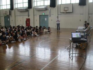 4年生は総合的な学習の時間で「共に生きる」の学習を行っています。今日は視聴覚障害者の方に来ていただき、体育館でお話を聞きました。普段の生活で困っていること、してほしいことなどについて質問することができました。