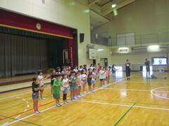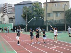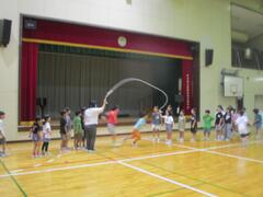 今朝は児童集会で長なわ跳びを行いました。各クラスで八の字跳びを3分間で何回跳べるのかを競いました。各クラス、声をかけて一生懸命跳んでいました。1年生も頑張っていました。結果は1位5−2の265回、2位5−1の246回、3位5−3の175回、4位6−2の151回、5位4−2の128回でした。