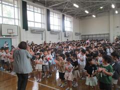 今日は今年度初めての全校での児童集会を校庭で行いました。集会委員が司会やルールの説明などしてくれ、全校で「じゃんけん列車」を行いました。1年生から6年生が仲良く楽しく行いました。