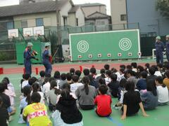 今日は2年生が交通安全教室を行いました。墨田区の交通指導員さんに横断歩道の歩き方や信号のある交差点の渡り方、自転車で注意することなど教えてもらいました。