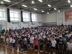 今朝の集会は今年度2回目の全校での長なわ集会を行いました。学級ごとに行い、八の字跳びを3分間で何回跳べるのかを数えました。1年生も頑張って跳ぶことができました。