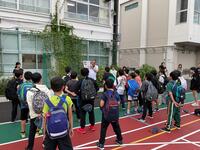 今日は、6年生が「世界陸上リアル教室」のイベントで、国立競技場にバスで行きました。かつての代表選手の方から、走り方や跳び方の練習方法を教えていただいてアップをした後、国立競技場のトラックを42m走りました。大会で使う大きな計時器に自分のタイムが表され、記録証をいただきました。すべてのプログラムが終わってから観客席で、大きな競技場を見ながらお弁当を食べました。大会で使われている砲丸や槍なども触らせてもらい、世界陸上大会をより興味深く観戦できる体験でした。