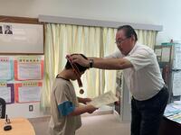 今日の全校朝会では、頑張った児童を紹介しました。「柔道」で東京都3位(4年)の立派な結果でした。あらためて校長先生から表彰状とメダルを渡してもらいました。